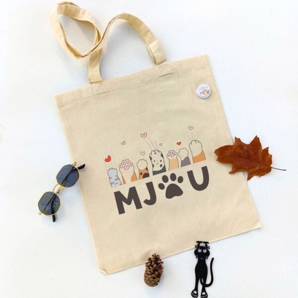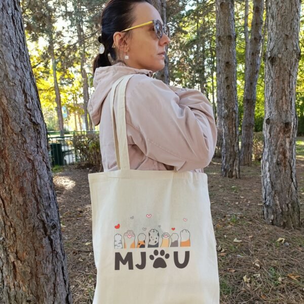 Na vrhu printa nalaze se šapice različitih boja, šara i oblika – svaka jedinstvena, kao i sama mačka. Neke imaju tufne, neke pruge, a sve zajedno šalju jasnu poruku: mjau znači volim te. U dnu dizajna, slova M, J i U formiraju reč mjau, dok slovo A zamenjuje crna šapa – simbol koji ujedinjuje sve što volimo kod ovih bića. Iznad svake šapice lepršaju srca u pastelnim tonovima, koja dodatno pojačavaju utisak ljubavi, igre i topline.