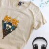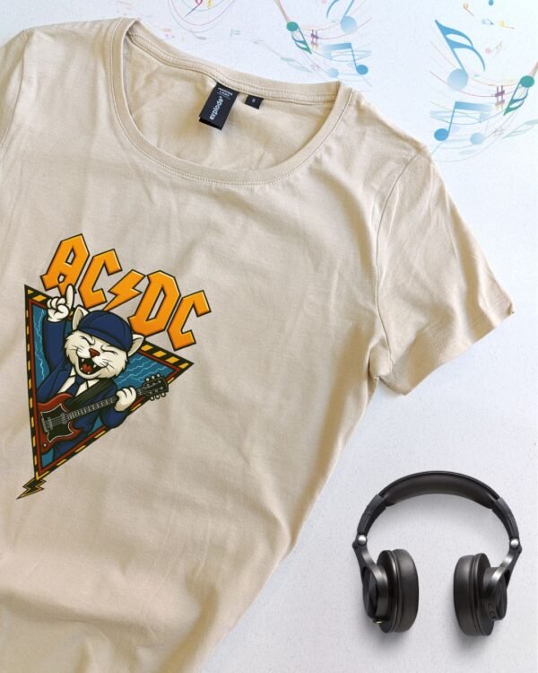 Na centralnom delu majice nalazi se ilustracija koja nikoga ne ostavlja ravnodušnim – mačka u prepoznatljivoj školskoj uniformi, sa gitarom u rukama, pozira u stilu legendarnog Angusa Younga. Podiže šapu u znak pobede, a iza nje se nalazi strujni trougao sa munjama, u vintage rokerskom stilu. Iznad nje, stoji naziv benda u originalnom AC/DC fontu, koji dodatno pojačava vizuelni doživljaj.