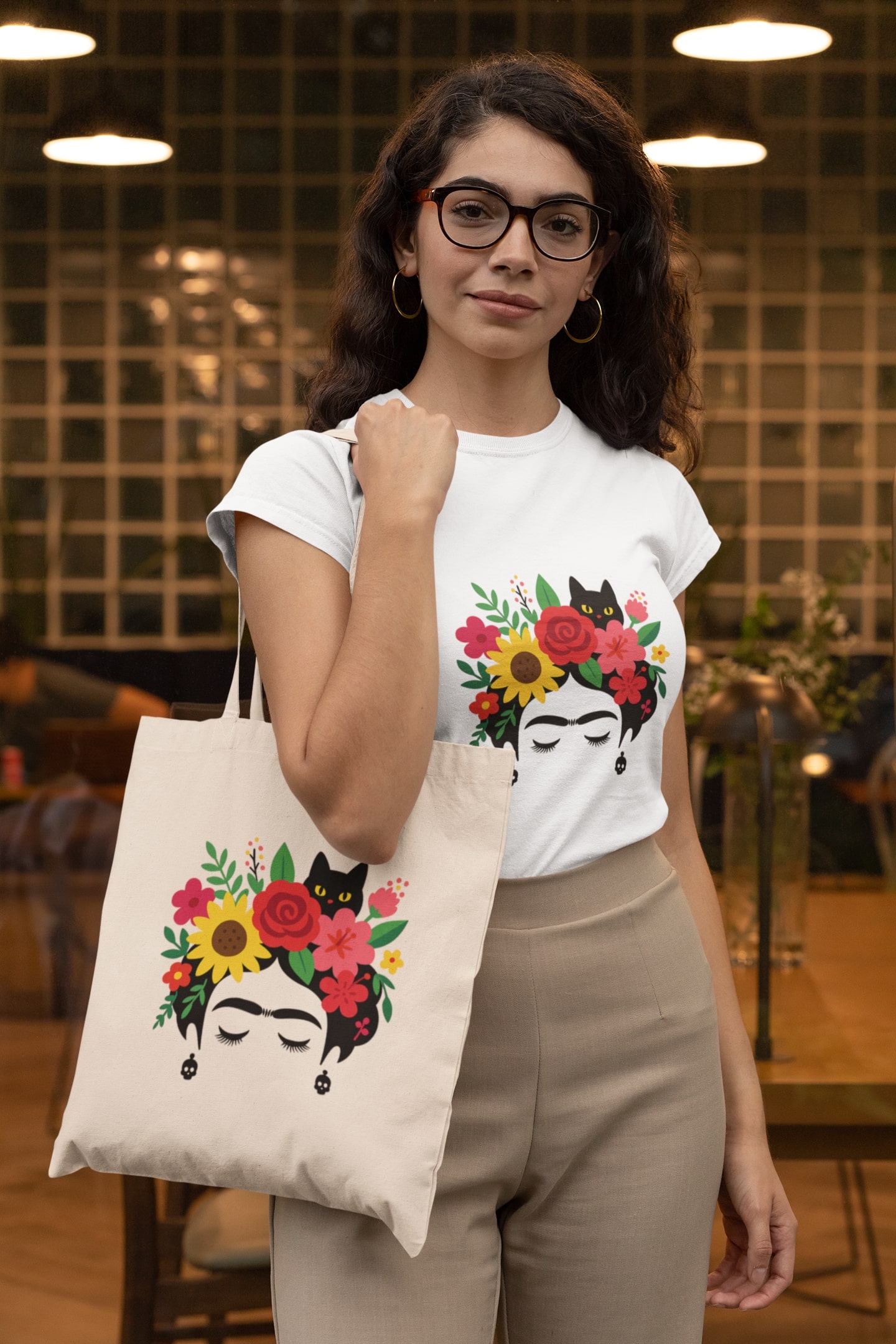 Na oba proizvoda se nalazi jedinstven Mačketina dizajn – silueta inspirisana slavnom umetnicom sa cvetnim vencem u kosi, ali sa iznenađenjem: znatiželjna crna maca proviruje kroz latice. Ovaj motiv je savršena kombinacija umetnosti, prirode i ljubavi prema životinjama, posebno mačkama.