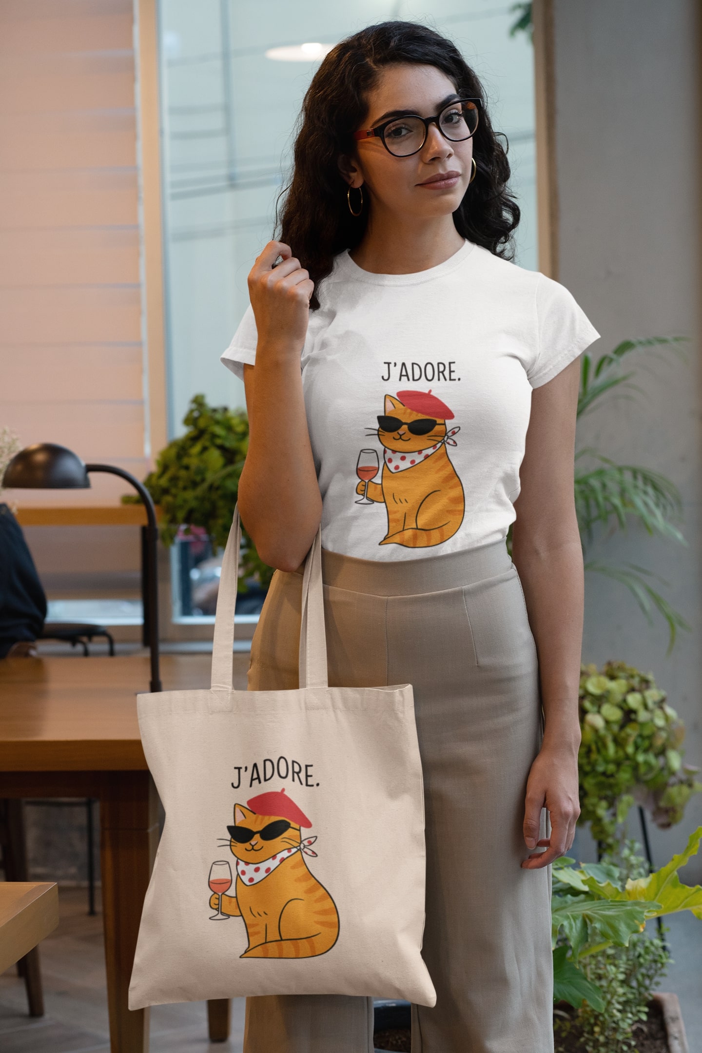 Na oba proizvoda se nalazi ista scena: simpatična narandžasta mačka sa beretkom, tufnastom maramom i sunčanim naočarima, uz natpis J’adore. – što na francuskom znači obooožavam! I zaista, obožavamo ovaj dizajn jer u njemu ima duha, humora i mačje elegancije.
