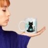 Na šolji dominira Mačketina dizajn – smirena crna mačka u meditativnoj pozi, koja u šapicama drži šolju iz koje se puši topli napitak. Pozadina je nežna, sa apstraktnim plavo-zelenim oblicima koji asociraju na spokoj i tišinu. Uz dizajn se pojavljuju reči „mjau i polako“ – kao blagi podsetnici da ne žurimo, već da živimo u svom ritmu.